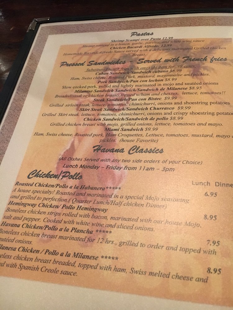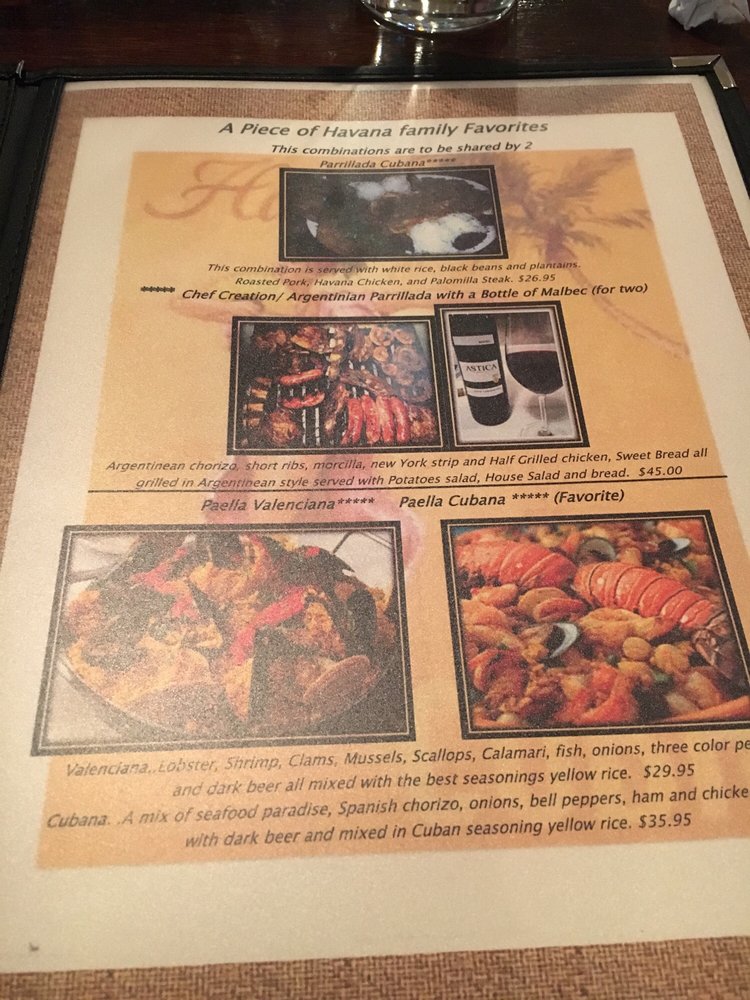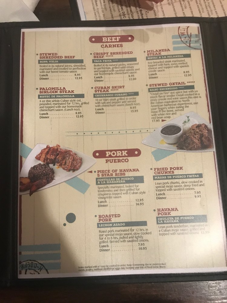 Served with White Rice, Black beans and Plantains, Roasted Pork, Havana Chicken and Palomilla Steak.